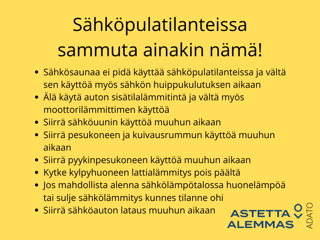 Teollisuus ja palveluyritykset alentavat omilla toimillaan sähkötehon tarvetta, mutta sähköä on säästettävä ja sähkönkäyttöä vältettävä arkisin huippukulutustuntien aikana myös kotitalouksissa.