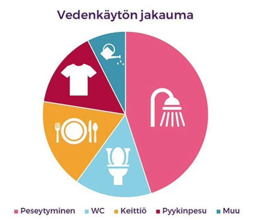 Vedenkäytön jakautuminen: peseytymiseen kuluu 45 %, keittiössä 17,5 %, WC:ssä 15 % ja pyykinpesussa 15 % vedestä. Lisäksi muuta vedenkulutusta on noin 7,5 %. Lähde: Kestävä veden käyttö – vedenkäyttöselvitys, Työtehoseura.